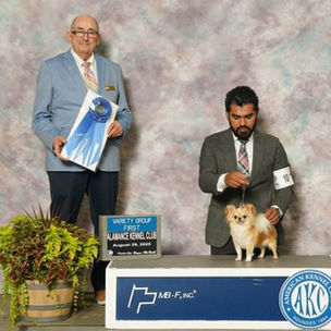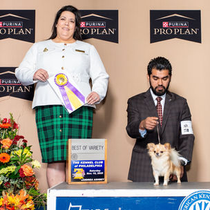 GCHB. CH A & A’s Phantom In The Dressing Room “Wanda” goes Select under breeder judge Linda George for a 5pt major and CH defeat in an entry of 67 long coat chihuahuas at AKC National Championship 2024 in Orlando FL